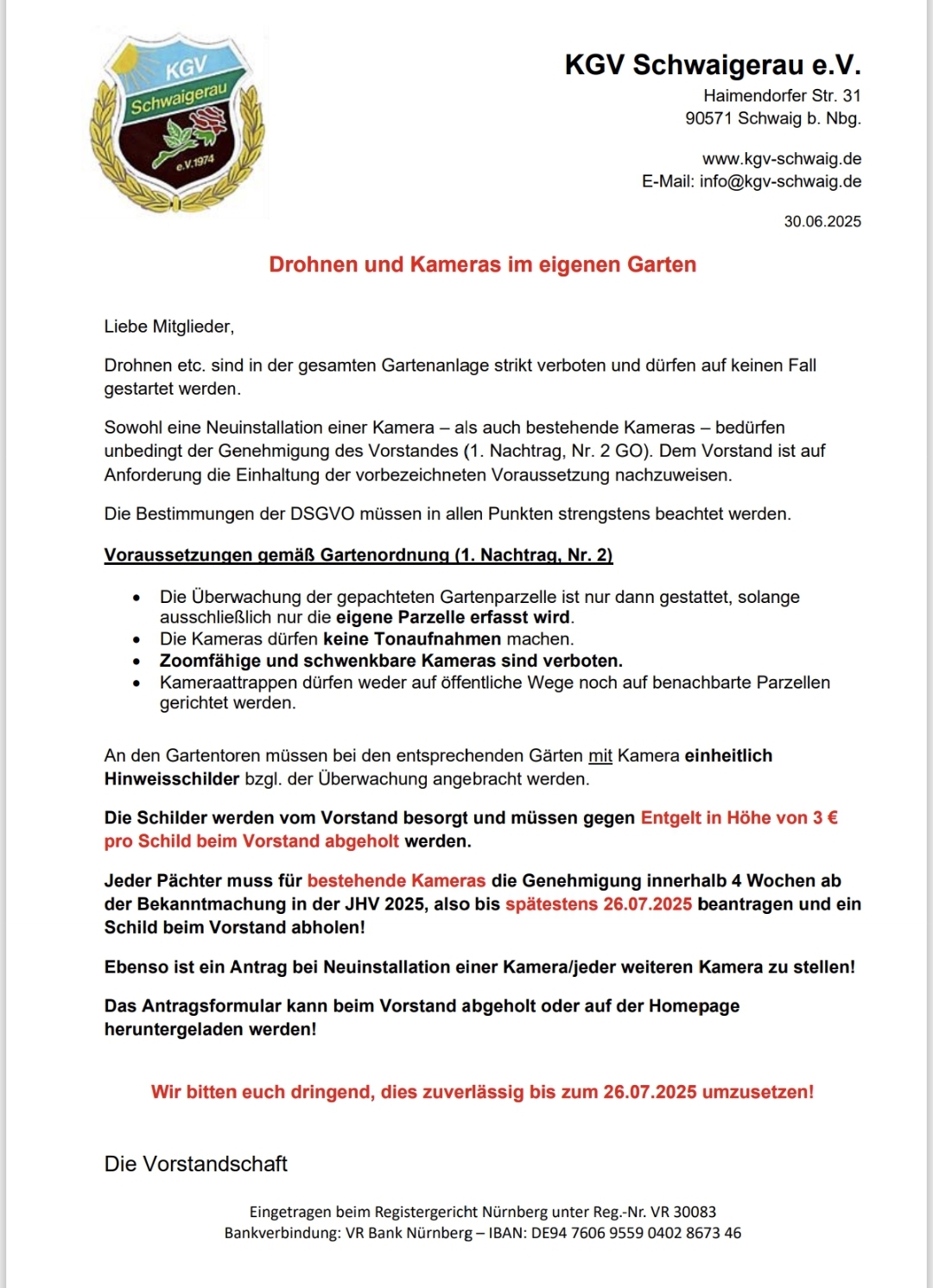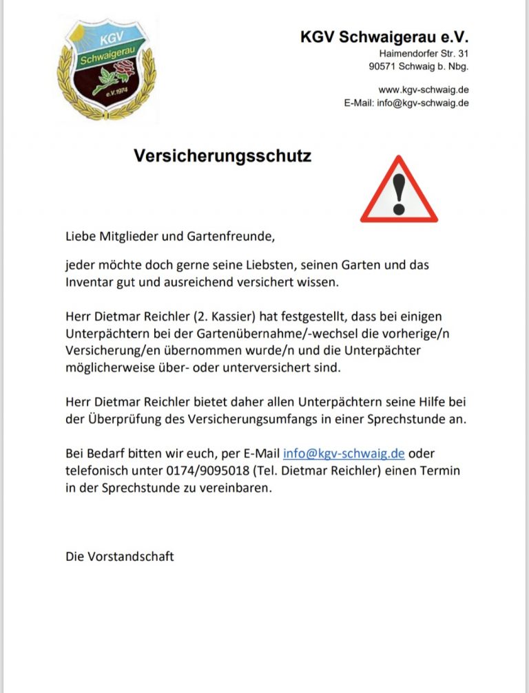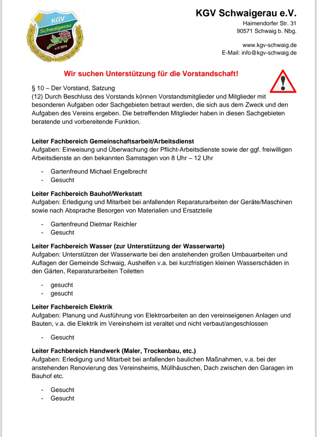 Bitte meldet euch bei Interesse persönlich oder per E-Mail (info@kgv-schwaig.de) bei der Vorstandschaft und gebt dabei an, welches Amt ihr übernehmen möchtet!